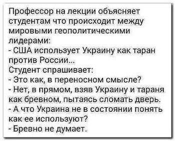 Тема вообще-то про Украину и разговор был, про то что там люди мрут... А их даже похоронить родственники не могут... Ещё слушок прошёл, что в ближайший месяц накроется вся эта евроинтиграция у Украины. Во многих европейских странах появились движения, которые объясняют простому люду, что для Украины Берндера и кто такие ПравоСеки... И простому люду это уже не так нравиться, как им вещали политики. При этом Поросёнок, стал хамить и не скрывает своё эго...